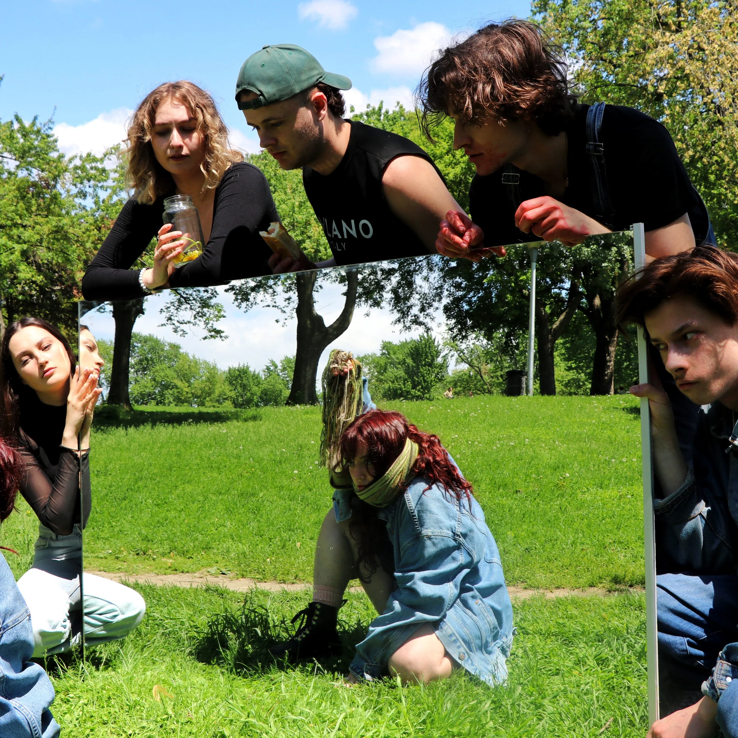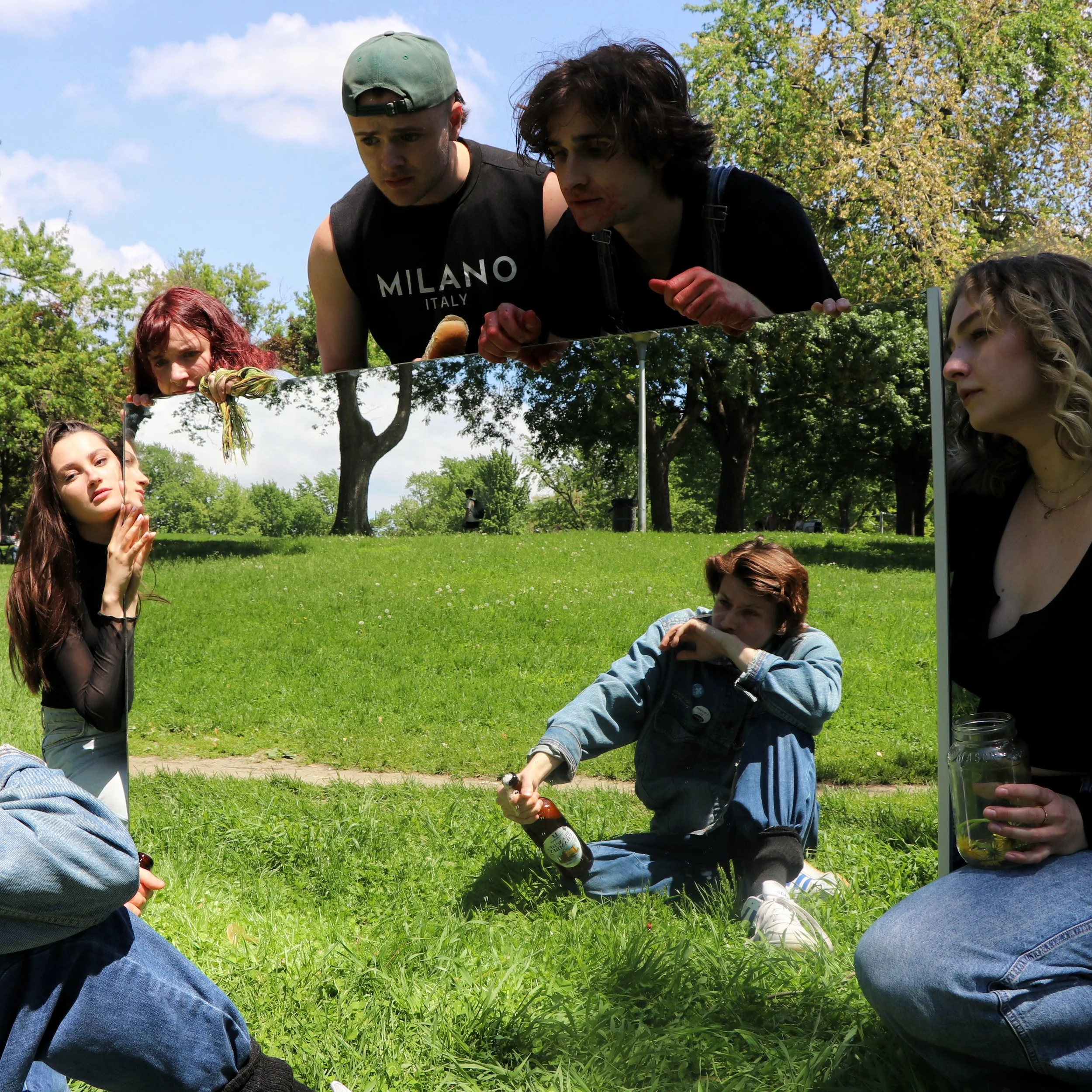 “We're entering a coming of age limbo, where six young adults explore their lives and ideas of themselves by telling stories and exploring ideas in a rapid stream of consciousness. We've built this non-location to represent the way we perceive ourselves, so mirrors become a main part of our set design and characters mirroring each other's physicalities and emotions and expression fill the stage to highlight the inner life of each character. We wanted to use this piece to explore the question: how do we think of the version of ourselves we project to others vs the one we truly feel inside? I consider it to be a synthesized version of ensemble theater where characters assist each other through imagery and chorus work.”