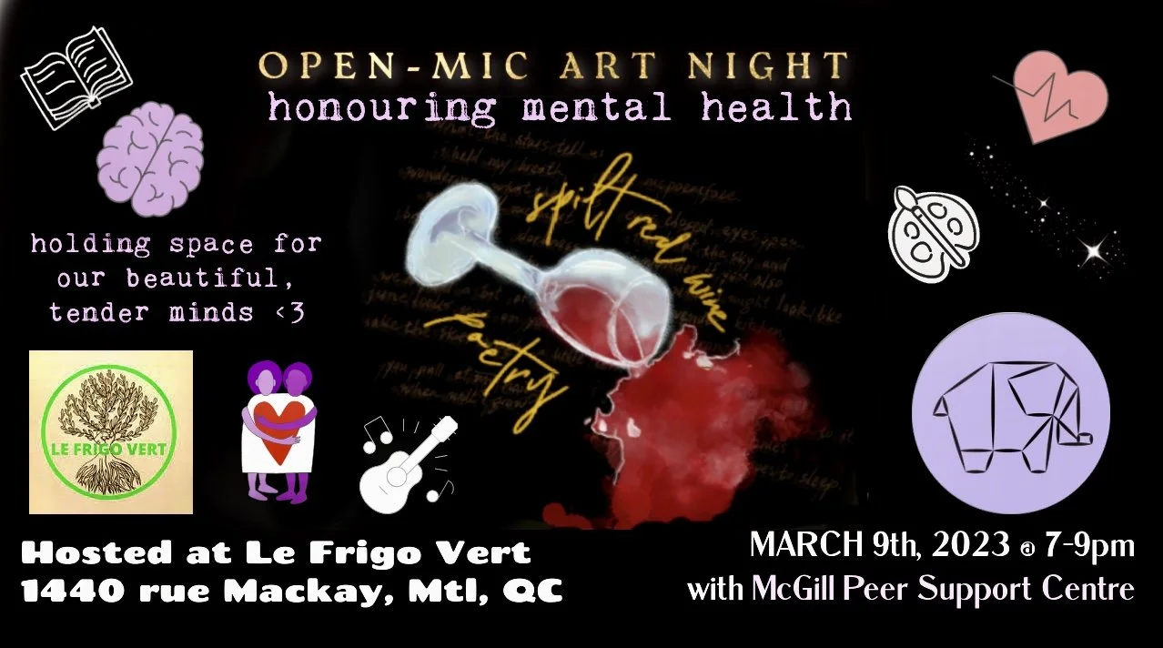 Spilt Red Wine Poetry is teaming up with McGill Peer Support Centre for an open mic art night to salve the soul. Share in any form, add to a collective canvas, stick your darker feelings into the Anonymous Venting Jar!