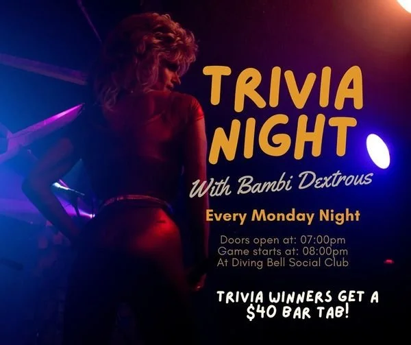 Every Monday at Diving Bell Social Club is Trivia Night hosted by Bambi Dexterous! Trivia night is fun in itself, but the winners get a $40 BAR TAB, and there’s just no better prize than a few free drinks!