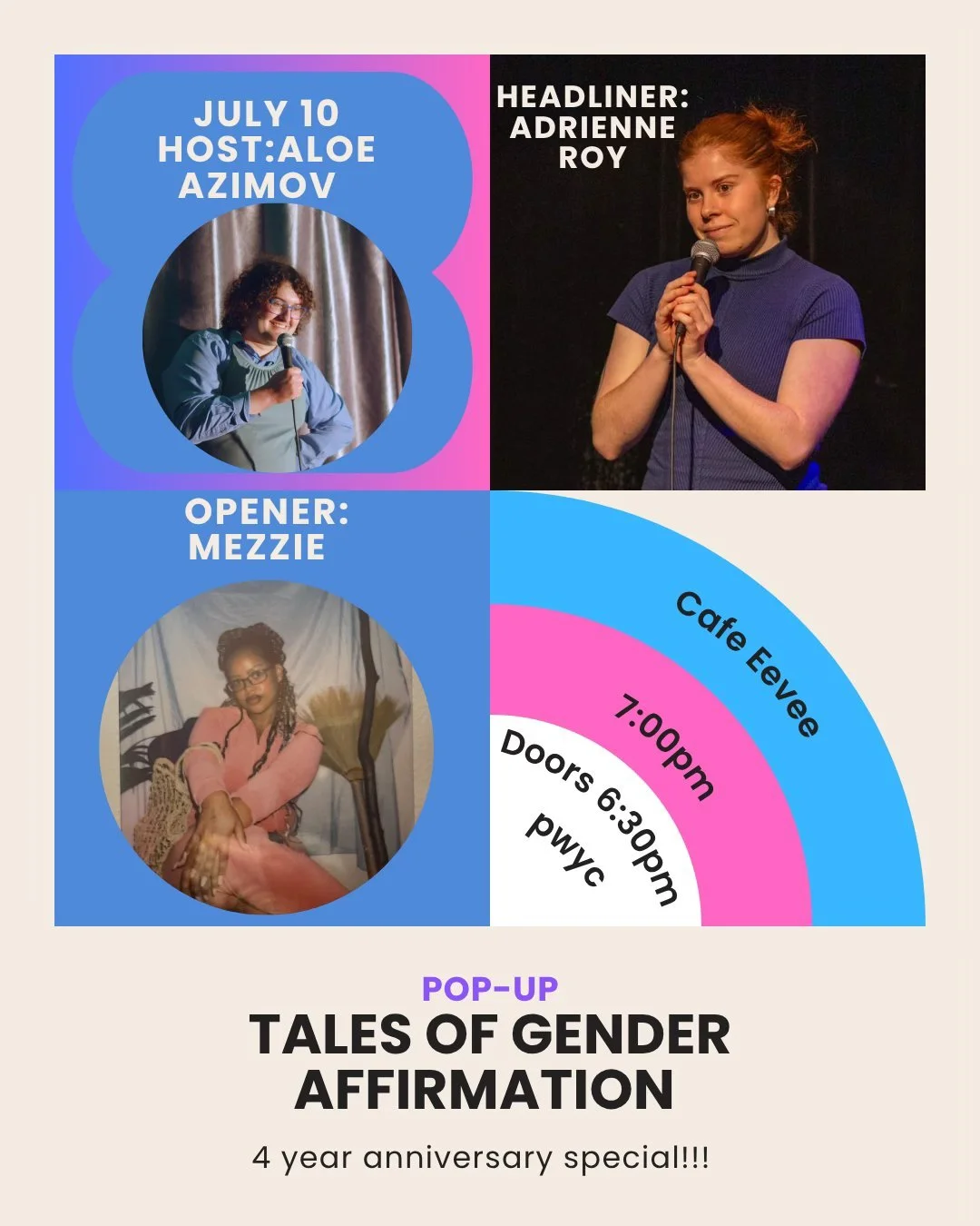 Get ready for the return of the sold out event series Tales of Gender Affirmation!!! With sold out shows for 2 years at The Diving Bell Social Club, A Full house OFF Just For Laughs & Zoofest show, and many festival appearances and themed fast tales shows and Halloween specials!!! Now they're back for a limited time for 3 Pop-up Shows at Cafe Eevee!!! Thursday July 10 is our 4 year anniversary show!!! Sat Aug 9 is our end of summer Pride show!!! And Sat Sept. 13th we kick off the fall right with lots of comedy!!! Catch Tales of Gender Affirmation, a dazzling comedy storytelling showcase of hilarious trans, non-binary, queer and gender non-conforming comedians+some allies while you can!!! Tickets are free to reserve on Eventbrite and pay what you can at the door at Cafe Eevee, 1251 Rue Saint-Zotique Est!!! Because we believe in financial accessibility! Showtime is 7pm with Doors 6:30pm, Thursday July 10th to kick things off with a bang for our four year anniversary show!!!