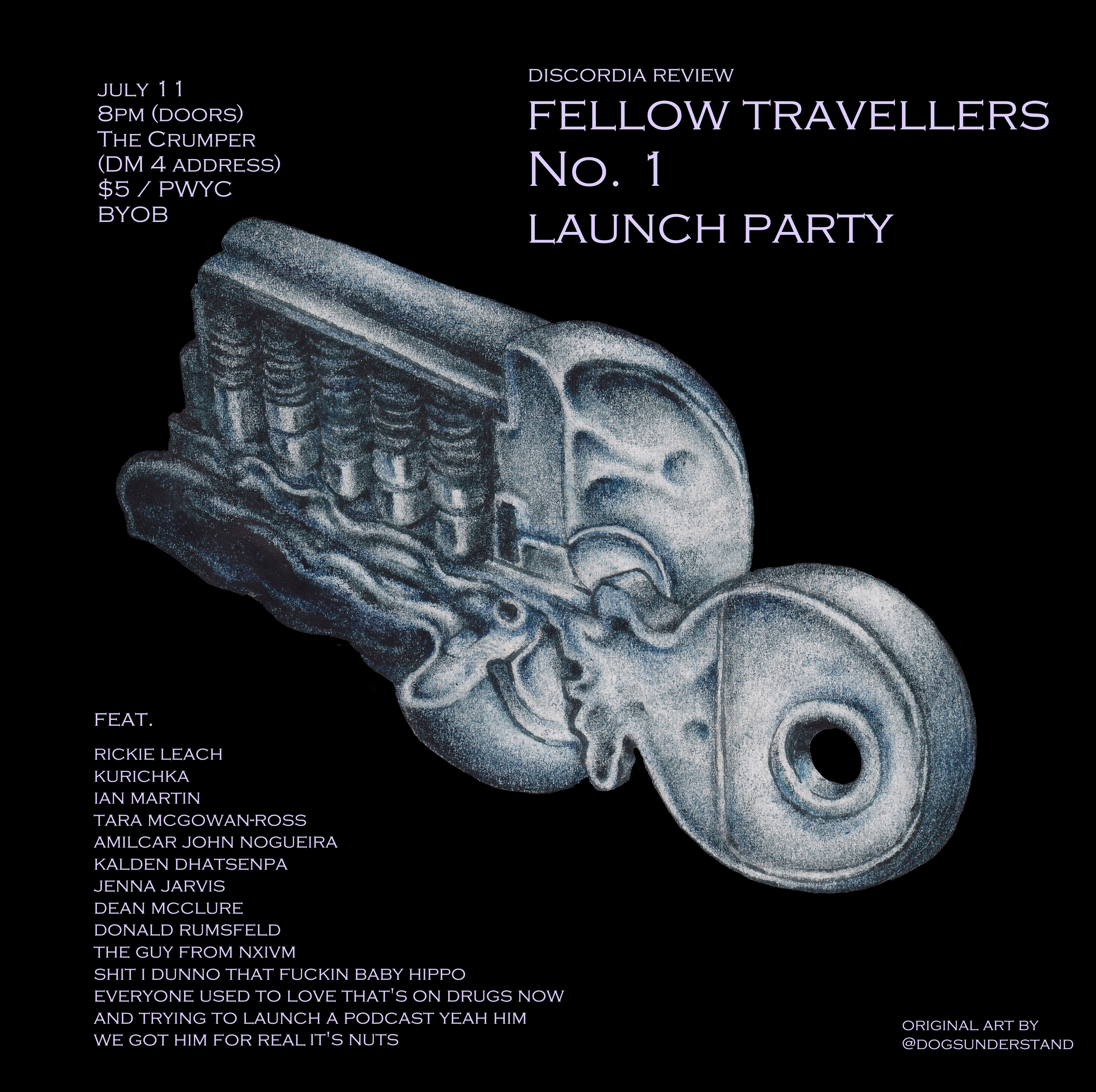 Welcome to the launch of the debut issue of Discordia Review's FELLOW TRAVELLERS, in which the guys who famously hate everything share art they don't hate. The first issue includes contributions from Jay Ryan Gobuty, Dimitri Karakostas, Fawn Parker, Riquita Lea, Gwen Aube, IAN MARTIN, dalton derkson, kurichka, and The Very Nice Interesting Singer Man Matt Farley, with art by Dogs Understand.