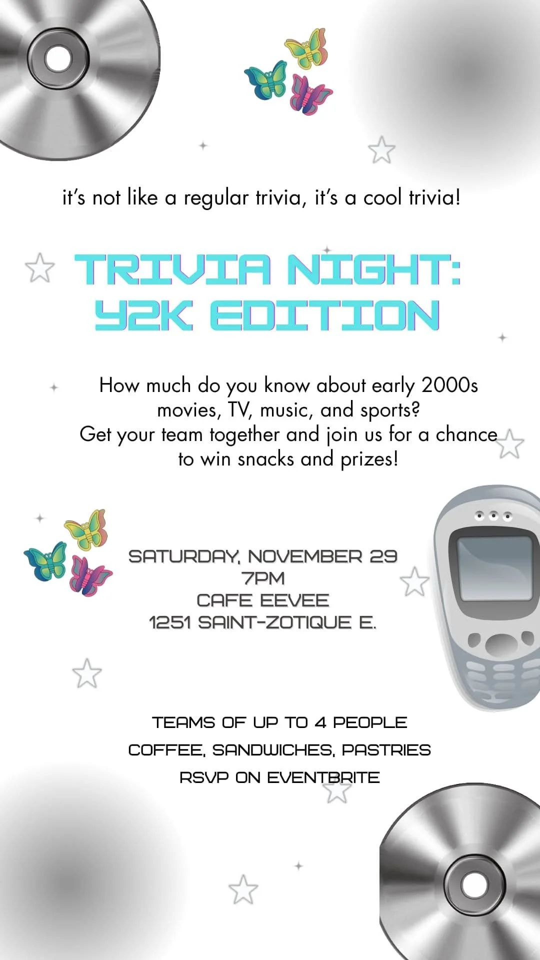Café Eevee is hosting another fun, fab trivia night, and this time it's all Y2K! Get Britney, Lindsey, and Paris on the line ASAP so y’all can team up real quick and win this thing. Teams of 4 compete.