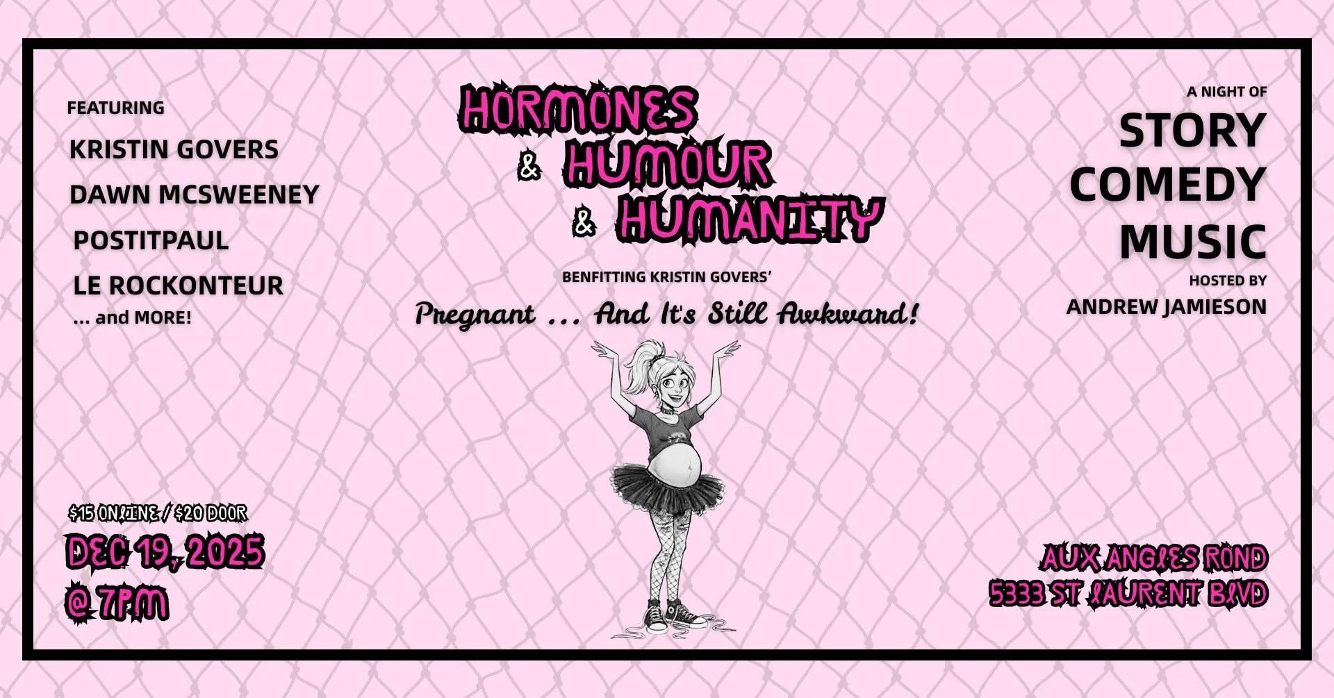 Hosted by Andrew Jamieson, performances by Le Rockonteur, PostitPaul, Dawn McSweeney, and more, will be scattered throughout the night. Headlining the event will be Kristin Govers, presenting a highly anticipated preview of Pregnant... And It’s Still Awkward! The evening promises entertainment, connection, and purpose.