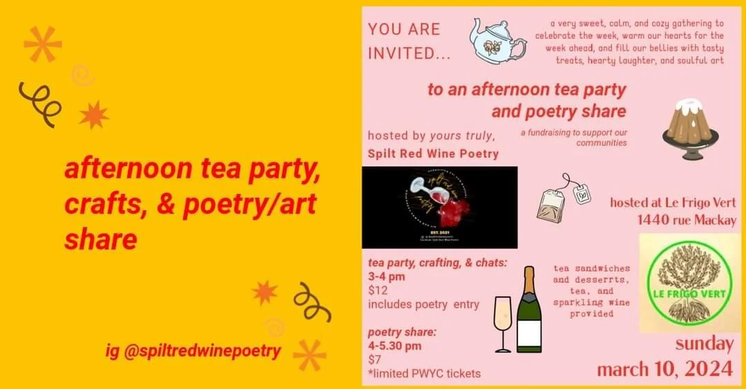 Tea, art, meaningful convos, and poetry. That's the perfect combo for a Sunday. Spilt Red Wine Poetry is back for their 25th edition. Proceeds from the event will go to Water First, a wonderful organization that helps Indigenous communities maintain access to clean drinking water.